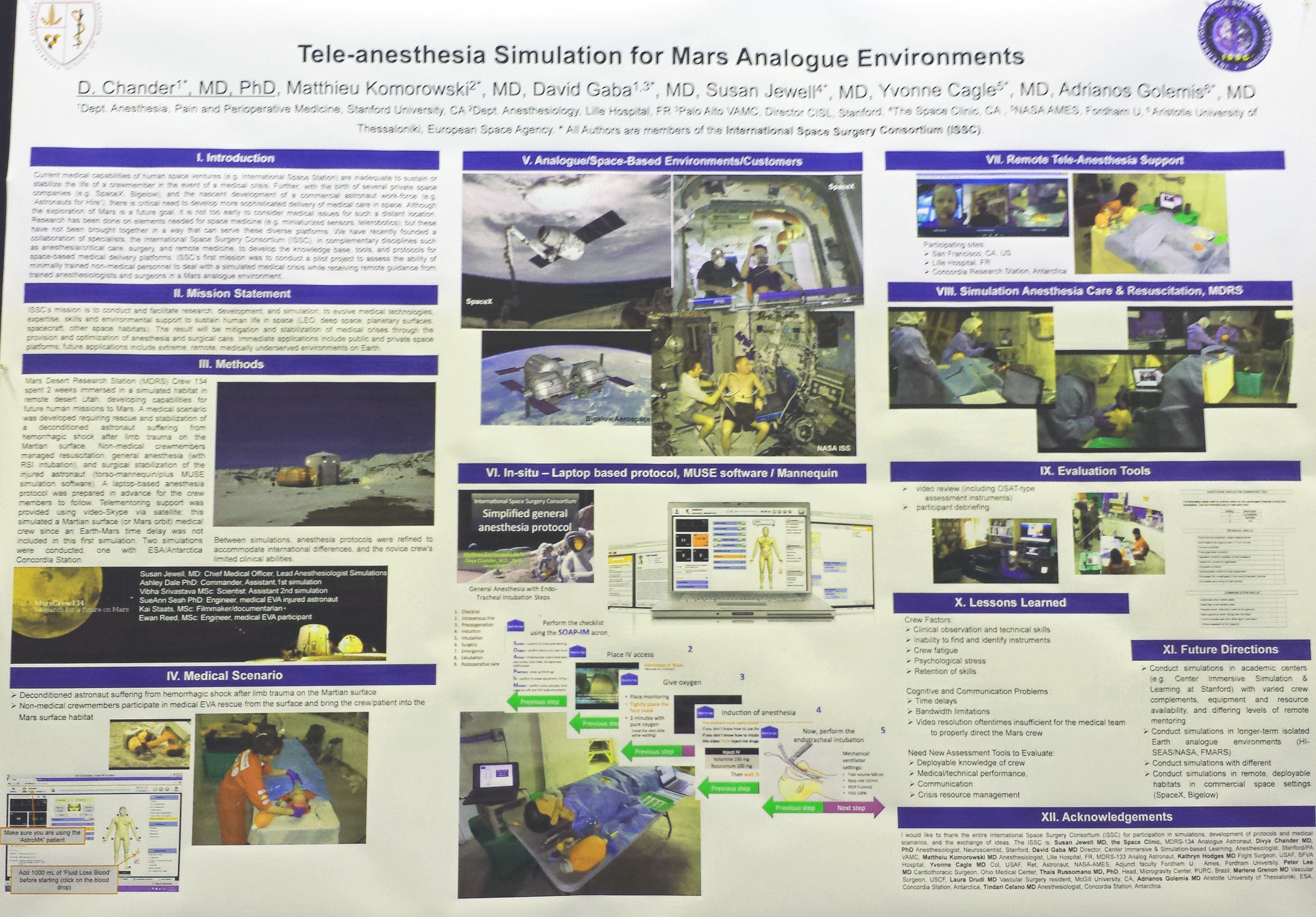Led by Principal Investigator (PI), Dr. Susan Jewell, Founder / CEO, Space Surgery Institute, SSI, with co-investigators, Dr Matthieu Komorowski (Lille Hospital), and collaborators from UCSF and Stanford University, the tele-anesthesia project conducted at Mars Desert Research Station (MDRS) was an initial pre-pilot protocol development and feasibility study in tele-anesthesia training for minimal-, or non-medically trained astronaut crews during deep space missions in space surgery.